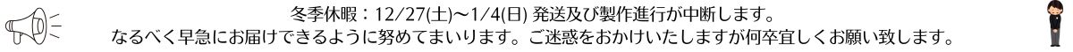 | 不良品 | 万が一不良品等がございましたら、交換をさせていただきます。 商品到着時に必ず商品をご確認ください。 ●ご注文商品と届いた商品が異なっている場合 ●損傷している商品 商品到着後、8日以内にお手数ではありますがメール又はお電話にてご連絡下さい。 それを過ぎますと返品交換のご要望はお受けできなくなりますので、ご了承下さい。 メール又はお電話でご連絡後の交換の流れ 商品を弊社に送料着払いにてお送り頂き、到着確認後、届いたその日(営業日)にお客様へ送料元払いで発送させて頂きます。 在庫が無い商品の場合は大至急製作致します。 納期は改めてメールにてご連絡致します。 |