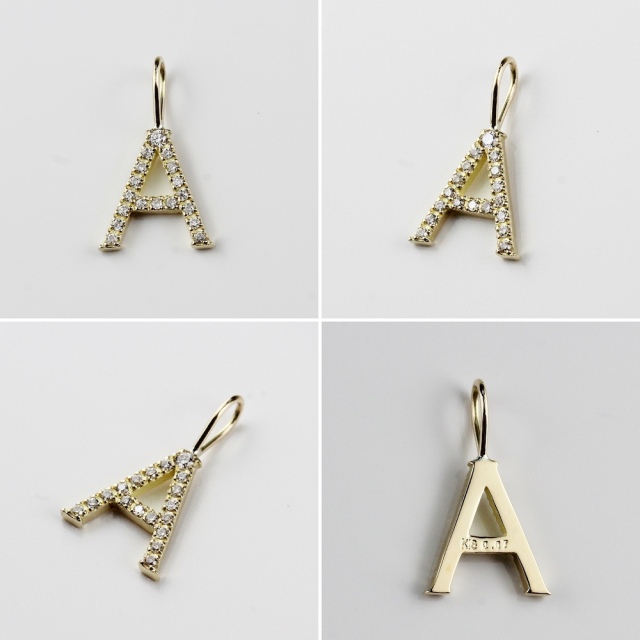 12石(約0.05ct)〜25石(約0.12ct)のダイヤモンドが輝く、選べる5種類のイニシャルチャーム(A、K、M、R、Y)